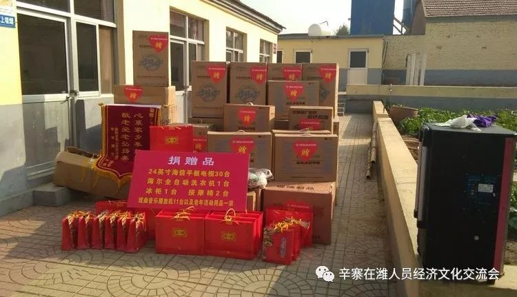 辛寨在潍人员经济文化交流会秘书长李成强同志向与会领导和乡亲们做了简短的汇报,向敬老院敬献物品,24英寸电视机30台,海尔519升冰柜一台,9升海尔全自动洗衣机一台,戏曲音乐播放机11台,按摩椅两台,拐杖50根及老年活动用品一宗,沈明新书记代表敬老院接收捐赠物品并向辛寨在潍人员赠送了锦旗。