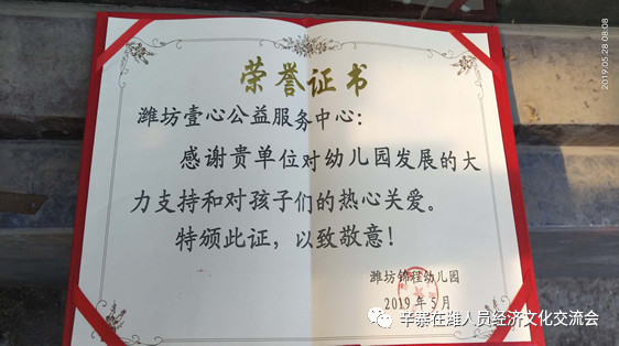 锦程幼儿园为潍坊壹心公益服务中心赠送锦旗、证书