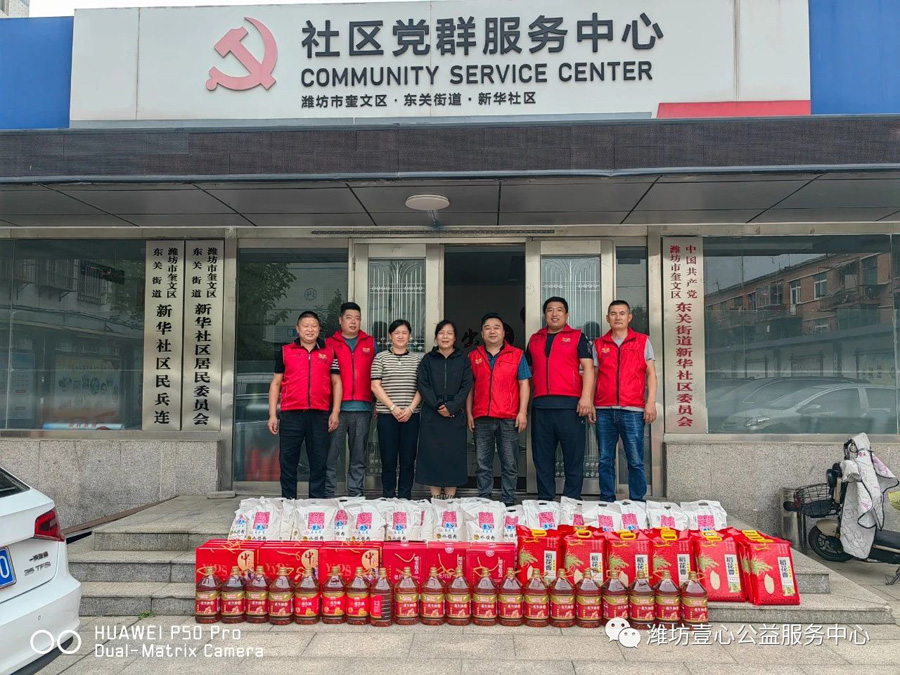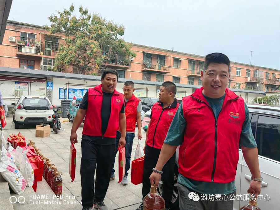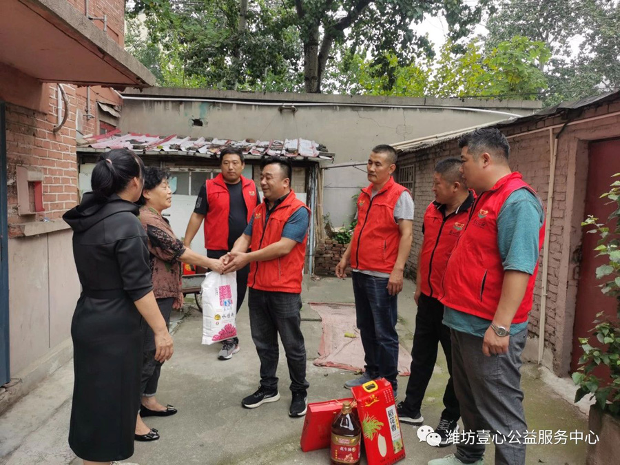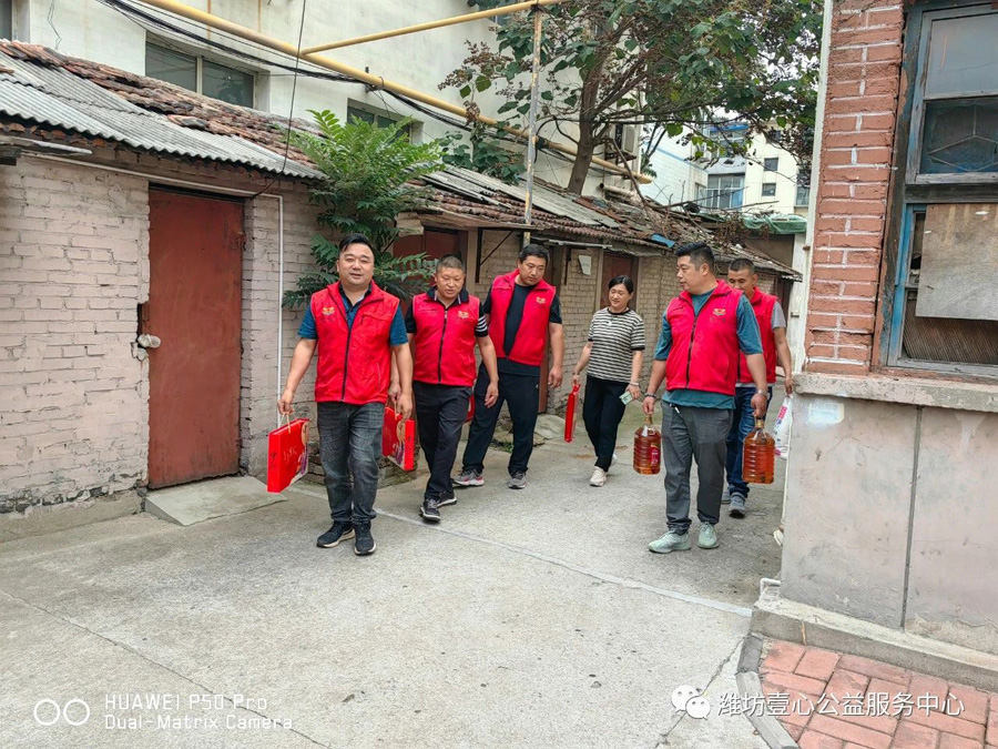 2023年9月26日,值此中秋国庆双节来临之际,潍坊壹心公益服务中心常务副理事长康志军、张赞、李法阳,理事王堃、付春勇、刘砚军,会同奎文区东关街办新华社区的工作人员,到振华小区、地毯厂宿舍、印刷厂宿舍等小区,走访看望20户困难家庭。不仅为困难家庭带去了大米、水饺粉、花生油、月饼等过节礼品,也带去了壹心公益全体爱心人士的浓浓关爱!