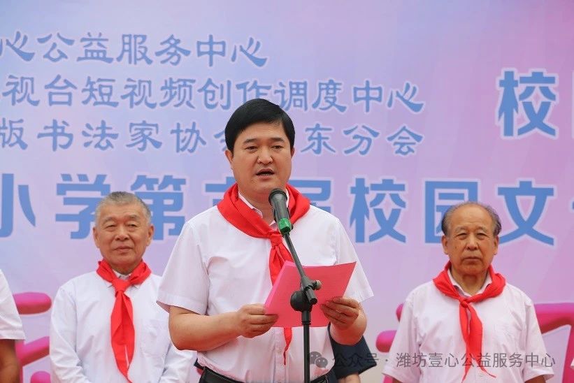 捐赠仪式现场,辛寨街道办事处党工委书记赵兴勇发表了热情洋溢的致辞:在这个美好的日子里,我们怀着无比喜悦的心情欢聚一堂,隆重举行杨家河小学校园捐赠仪式,为学校发放资助金、捐赠资助物品。在此,我代表辛寨街道党工委、办事处,向潍坊壹心公益服务中心、潍坊市广播电视台新媒体中心和中国新闻出版书法家协会山东分会的真诚爱心和高尚善举,表示崇高的敬意;向一直以来关心、支持辛寨街道教育事业发展的各位领导和社会各界朋友,表示衷心的感谢!